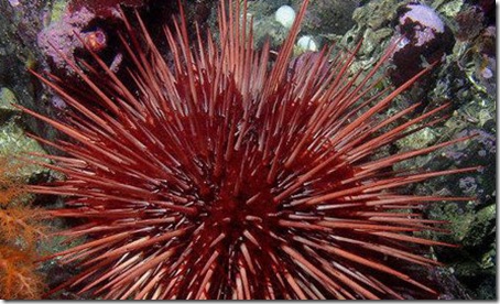 The red sea urchin or Strongylocentrotus franciscanus is found only in the Pacific Ocean, primarily along the West Coast of North America. It lives in shallow, sometimes rocky, waters from the low-tide line down to to 90 meters, but they stay out of extremely wavy areas. They crawl along the ocean floor using their spines as stilts. If you discover one, remember to respect your elders — some specimens are more than 200 years old.